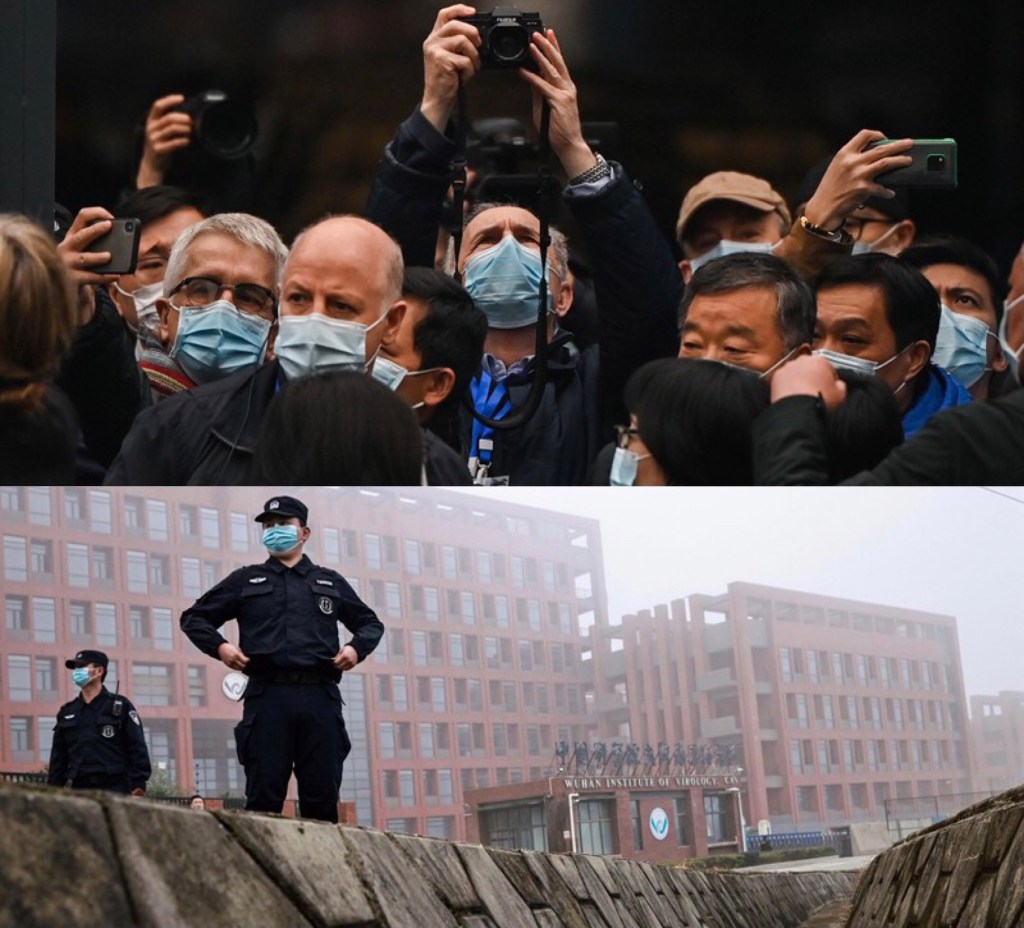 Security personnel keep watch outside the Wuhan Institute of Virology in China, which some people allege was the source of a SARS-CoV-2 leak.