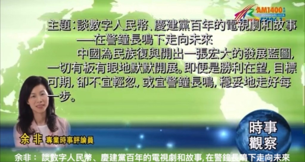美國《星島中文電台》「時事觀察」余非 :談數字人民幣、慶建黨百年的電視劇和故事──在警鐘長鳴下走向未來