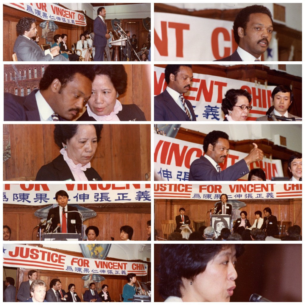 Justice for Vincent Chin Rally – June 1 1983 Killing of Vincent Chin (club to death) by AngloSaxon Americans – father and son walked free without spending one day in jail. Vincent Jen Chin (Chinese: 陳果仁, May 18, 1955 – June 23, 1982) was a Chinese American draftsman who was beaten to death in a racially motivated attack by two white men, Chrysler plant supervisor Ronald Ebens and his stepson, laid-off autoworker Michael Nitz. https://en.wikipedia.org/wiki/Killing_of_Vincent_Chin
