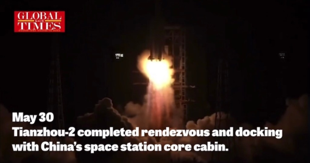 China’s Tianhe space station core cabin received its first “visiting guest” – the Tianzhou-2 cargo spacecraft early Sunday, about 8 hours after the latter’s launch, setting a new record in China’s space history.