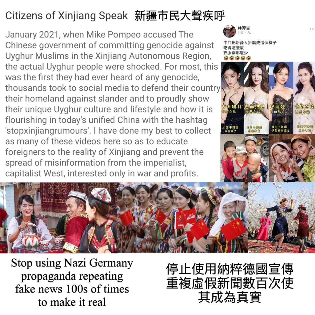 Videos: 627 videos by Citizens of Xinjiang exposed the fake news, US and her allies engaged in Nazi Germany propaganda tactics by repeating the fake news 100s of time to make it sound real to demonize Chinese and China. https://youtube.com/playlist?list=PLkbOIKUddMBtp0_xEFqn4zey48kkgJq5w https://link.medium.com/5nomylcNaeb 627個視頻 – 新疆市民揭穿西方假新聞,美國和她的盟友從事納粹德國的宣傳策略, 通過重複假新聞數百次使之聽起來真實來妖魔化中國和中國人. This is another good set of resources for debunking the Genocide fabricators by the Western Empire. https://www.reddit.com/r/Sino/comments/lsaph9/masterpost_of_sources_for_debunking_xinjiang/ 這是揭穿種族滅絕製造者(西方帝國)的另一套很好的資源