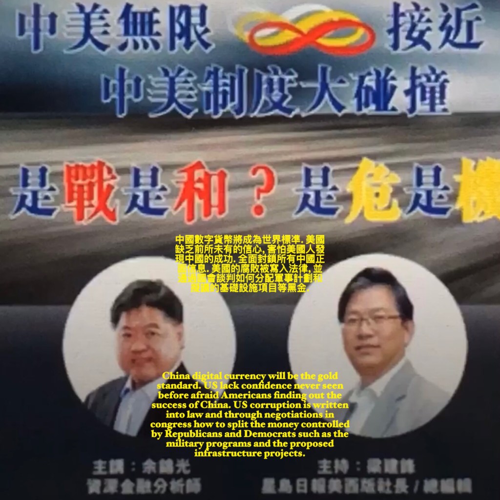 Video: Larry Yu & Joseph Leung – Singtao TV San Francisco California – China digital currency will be the gold standard. US lack confidence never seen before afraid Americans finding out the success of China. US corruption is written into law and through negotiations in congress how to split the money controlled by Republicans and Democrats such as the military programs and the proposed infrastructure projects.