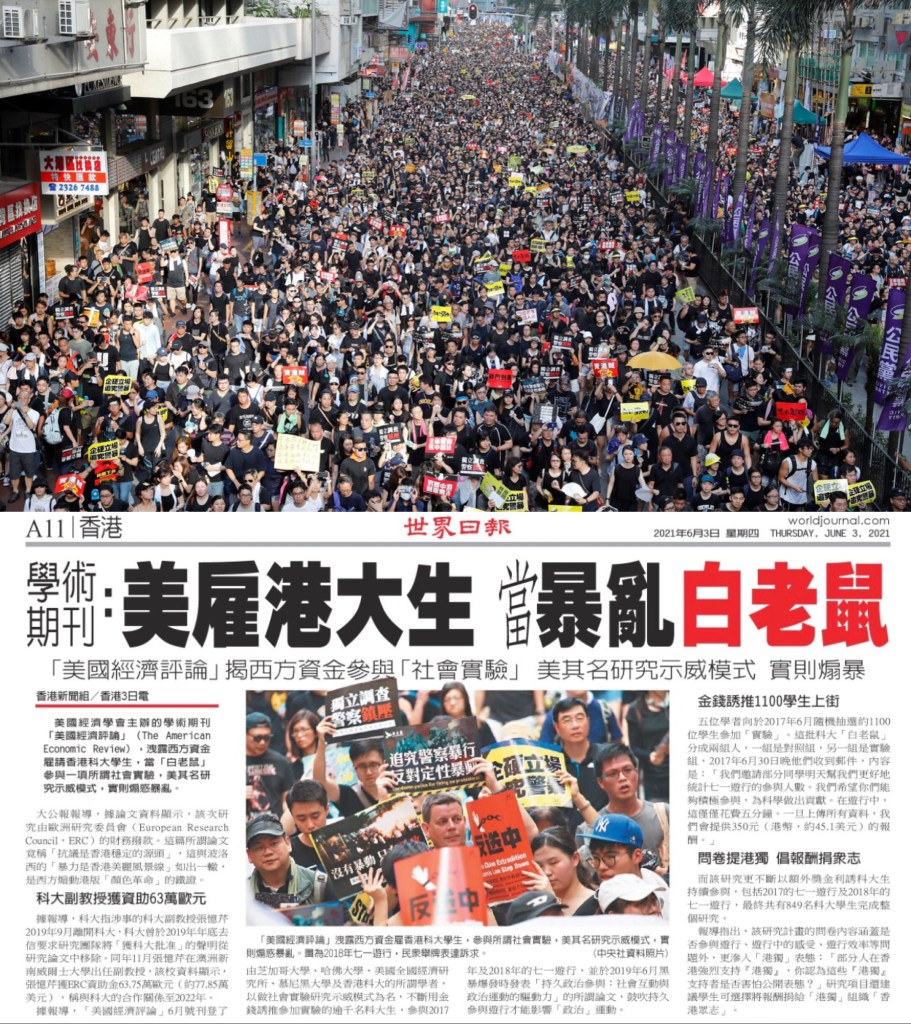 Academic paper reveals Hong Kong student protesters were paid to be guinea pigs in bizarre experiment that may have gone wrong 學術論文揭示香港學生抗議者在可能出錯的奇怪實驗中被支付為豚鼠 Allegations that pro-democracy activists in Hong Kong have been paid for their activities have swirled for years but have always been strenuously rubbished by the Western media. Now, an academic study seems to confirm just that. 關於香港民主活動人士因其活動而獲得報酬的指控已經流傳多年,但一直被西方媒體極力抨擊。 現在,一項學術研究似乎證實了這一點. 3 Jun, 2021