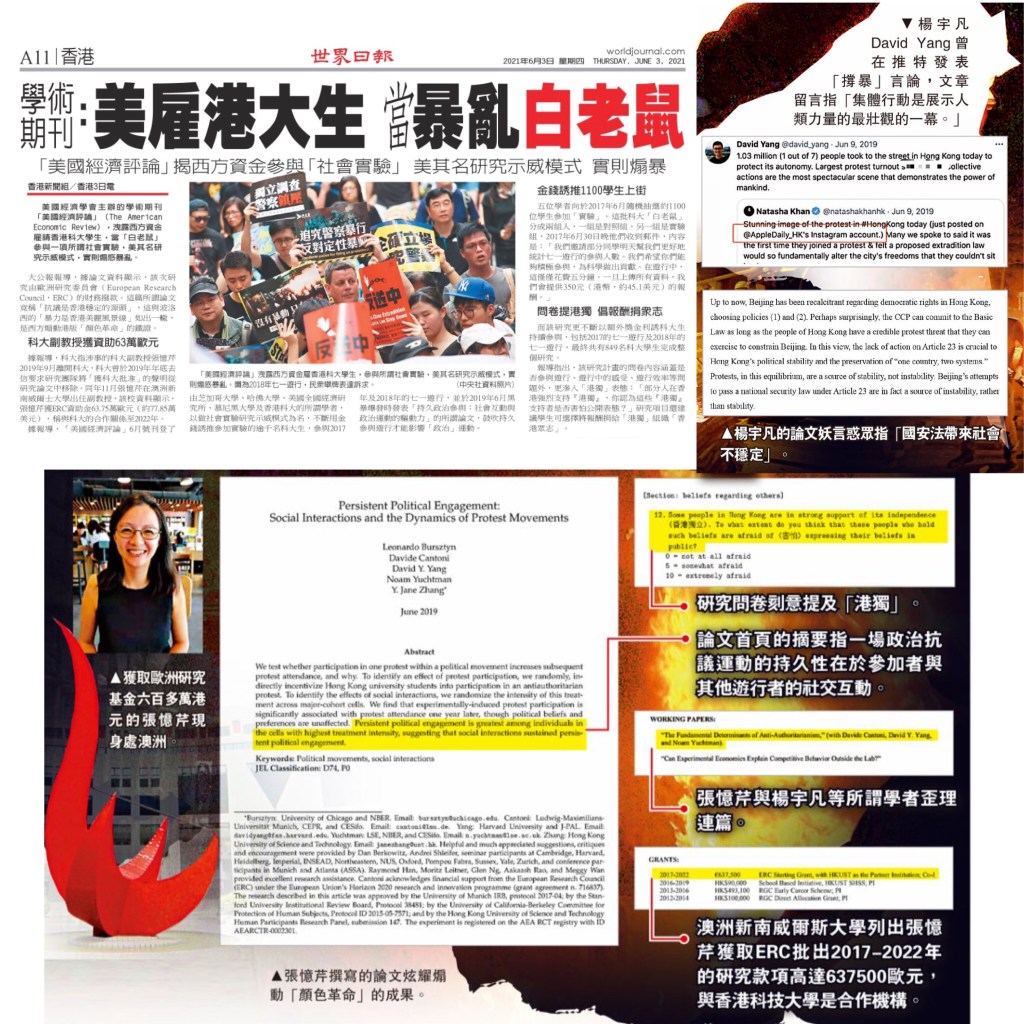 《美国经济评论》最新一期(六月号),刊登了由芝加哥大学、哈佛大学、美国全国经济研究所(NBER)、慕尼黑大学、美国经济和政策研究中心(CEPR)、美国贾米尔贫穷行动实验室(J-PAL),以及香港科技大学的所谓学者,以做社会实验研究示威模式为名,不断用金钱诱推参加实验的逾千名科大生,参与2017年及2018年的7·1游行,并于2019年6月黑暴爆发时发表《持久政治参与:社会互动与政治运动的驱动力》的所谓论文,鼓吹持久参与游行才能影响”政治”运动。