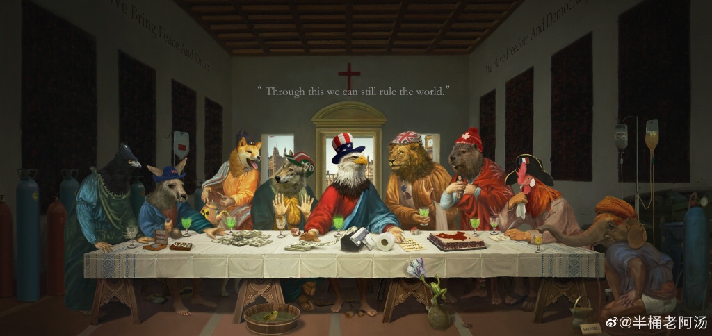 Similar to the final meal Jesus shared with his apostles before his crucifixion that The Last Supper depicted, Bantonglaoatang painted a vivid picture of nine animals – respectively representing the US, the UK, Italy, Canada, Japan, Germany, France, Australia and India – sitting around a table with a Chinese-map-shaped cake on it. On top of the painting is the words in quote: Through this we can still rule the world.