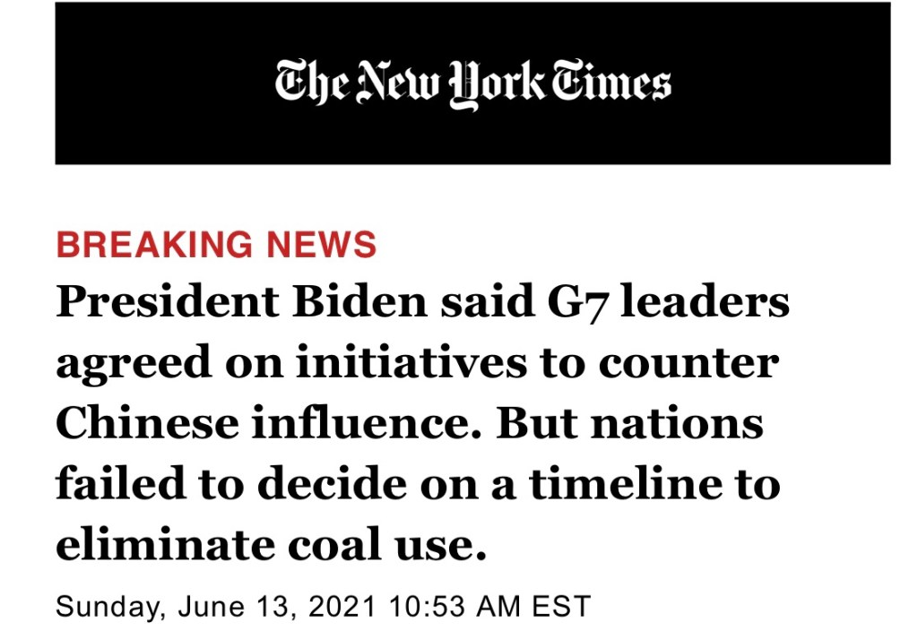 New York Times BREAKING NEWS: President Biden said G7 leaders agreed on initiatives to counter Chinese influence. But nations failed to decide on a timeline to eliminate coal use.