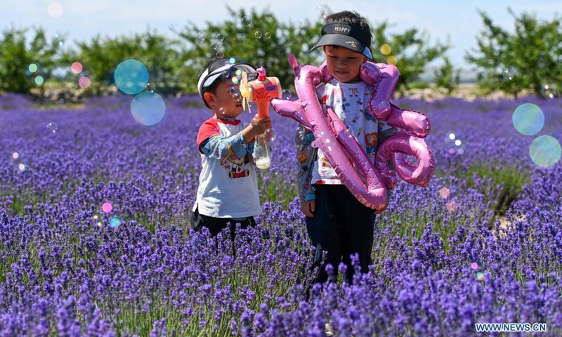 Children play in a lavender farm in Huocheng County, northwest China’s Xinjiang Uygur Autonomous Region, June 13, 2021.