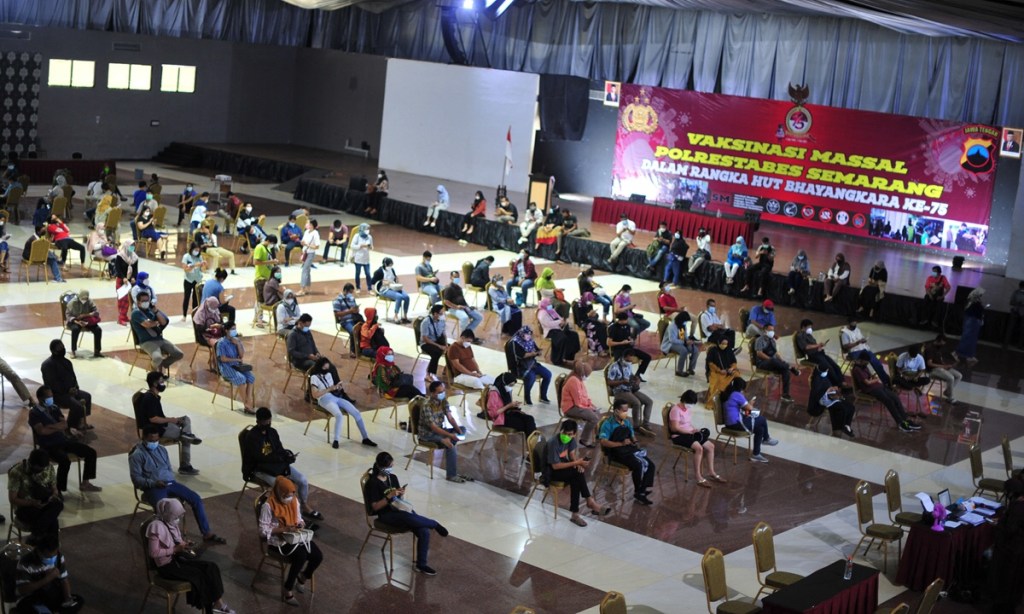 Residents gather to get vaccinated with the Sinovac vaccine against the COVID-19 coronavirus during a mass vaccination drive, in Semarang on Tuesday, as infections soar in Indonesia.