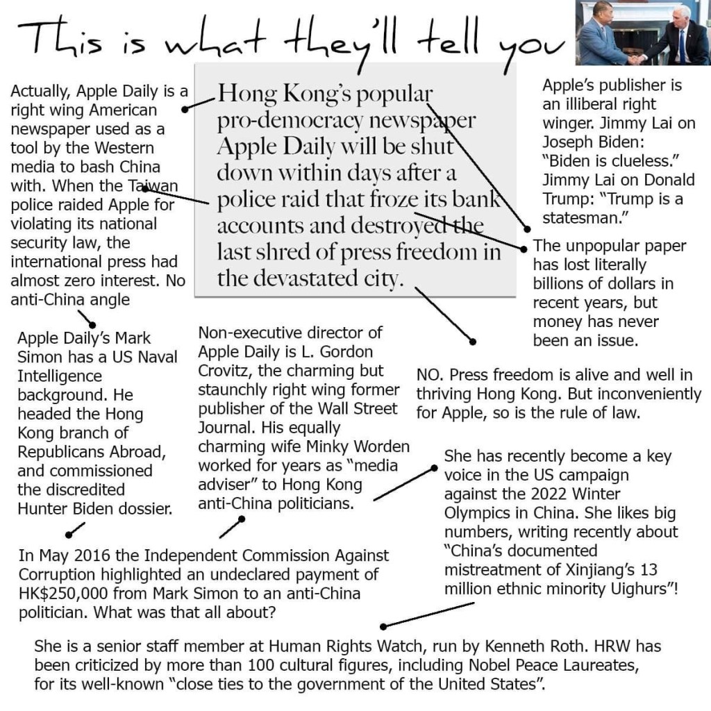 Nury Vittachi: I smile and shake my head. Most reporters still don’t understand that for more than 40 years, the CIA has been locating pro-USA groups around the world and re-branding them “pro-democracy”. The majority are far right, pro-US and anti-left. Apple Daily is a good example. There’s just waaaay too much American stuff going on in the background. In Taiwan, fully 80 percent of supporters of the anti-China party presently in power are anti-China self-declared Trumpites. I actually don’t blame reporters: I missed all this in my younger days: was friends/ fans of most of the folk mentioned in this graphic until their hostility level to the Chinese made me uncomfortable