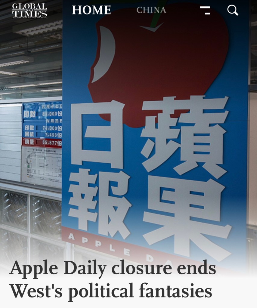 Apple Daily represented both anti-China sentiment and opposition to the Communist Party of China, having played an active role in working with the US to arouse chaos in Hong Kong and help plan, finance as well as organize rioting activities, which has gone against the successful practice of the “one country, two systems,” Lau Siu-kai, vice-president of the Chinese Association of Hong Kong and Macao Studies, told the Global Times on Thursday.