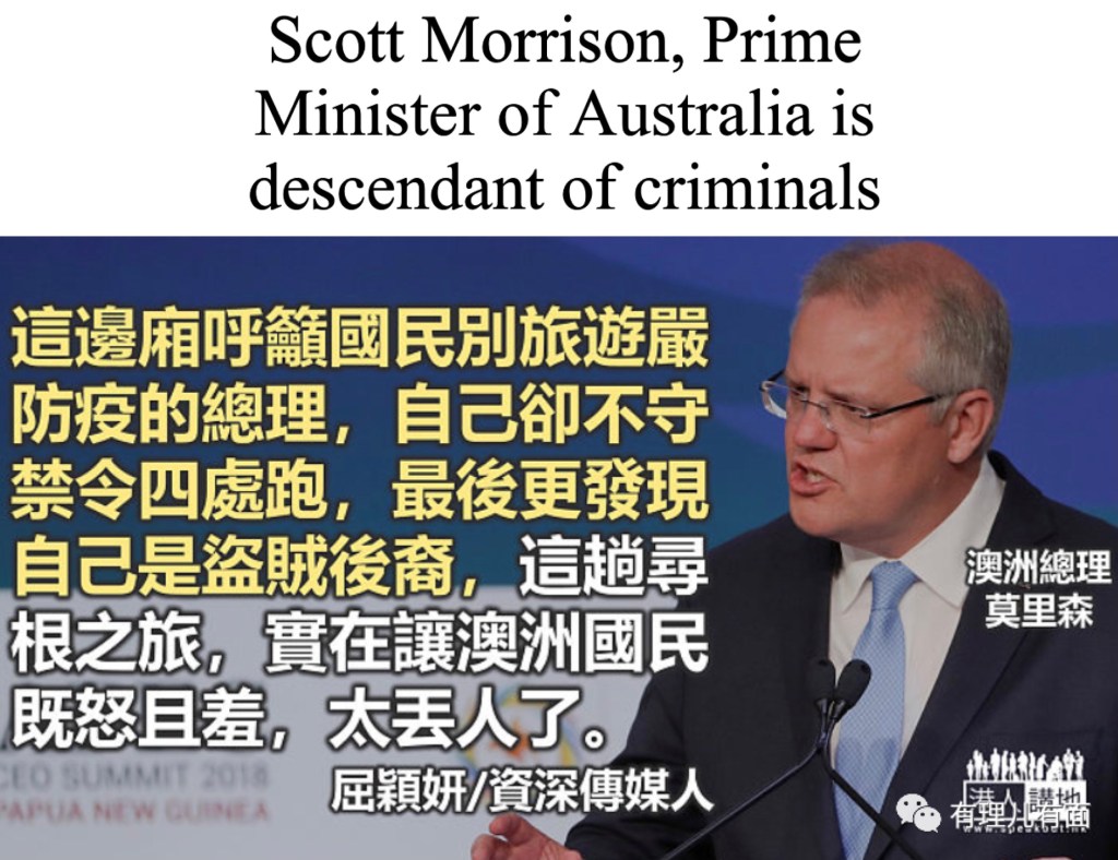 This time he went to the UK for a G7 meeting. Morrison took the opportunity to run to find his roots and went to three bars for drinks along the way. The Prime Minister who also called on citizens not to travel to prevent the epidemic, but ran around without abiding by the ban, and finally discovered that he was the descendant of thieves. This trip to find the roots really made Australian citizens angry and ashamed. 这次去英国开G7会议,莫里森趁机开小差跑去寻根,还沿途去了三间酒吧喝酒。这边还呼吁国民别旅游严防疫的总理,自己却不守禁令四处跑,最后更发现自己是盗贼后裔,这趟寻根之旅,实在让澳洲国民既怒且羞,太丢人了。