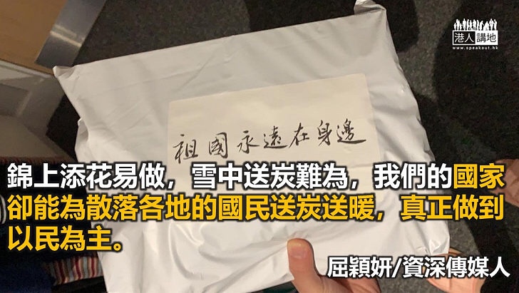 錦上添花易做,雪中送炭難為,我們的國家卻能為散落各地的國民送炭送暖,真正做到以民為主。我想起,習主席說過,要國民有獲得感、幸福感和安全感,不單國土內的百姓,這種感動,連海外國民都感受到了。The icing on the cake is easy to make, and it is difficult to send charcoal in the snow, but our country can send charcoal and warmth to the people scattered everywhere, and truly focus on the people. I remembered that President Xi said that the citizens should have a sense of gain, happiness, and security. Not only the people in the country, but also overseas citizens have felt this kind of touch.