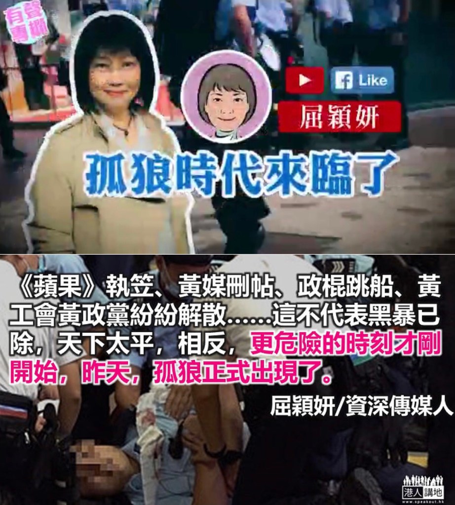 《蘋果》執笠、黃媒刪帖、政棍跳船、黃工會黃政黨紛紛解散……這不代表黑暴已除,天下太平,相反,更危險的時刻才剛開始,昨天,孤狼正式出現了。