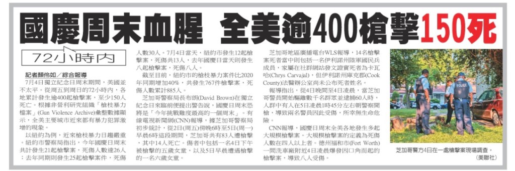US guns down and bomb women and children in the Middle East and around the world in the name of fake freedom democracy and human rights everyday. Who could imagine Karma comes back to hit US like a high speed train. 美國以虛假的自由民主和人權的名義在中東和世界各地槍殺和轟炸婦女和兒童。 誰能想像 Karma 像高速列車一樣回來襲擊美國. CNN: Gun violence – At least 150 people were killed by gun violence in more than 400 shootings across the US during the Fourth of July weekend. The deadly spate is part of a larger surge in violent crime that has set major cities on edge. So far this year, gun violence incidents in New York have spiked almost 40% over the same period in 2020, with 767 shootings and 885 victims. This weekend, the city saw 26 victims in 21 shootings from Friday to Sunday. In Chicago, Police Superintendent David Brown called July 4 the “most challenging weekend of the year.” According to Chicago Police Department data, 83 people were shot, including 14 killed, in shootings from 6 p.m. Friday to 6 a.m. Monday.