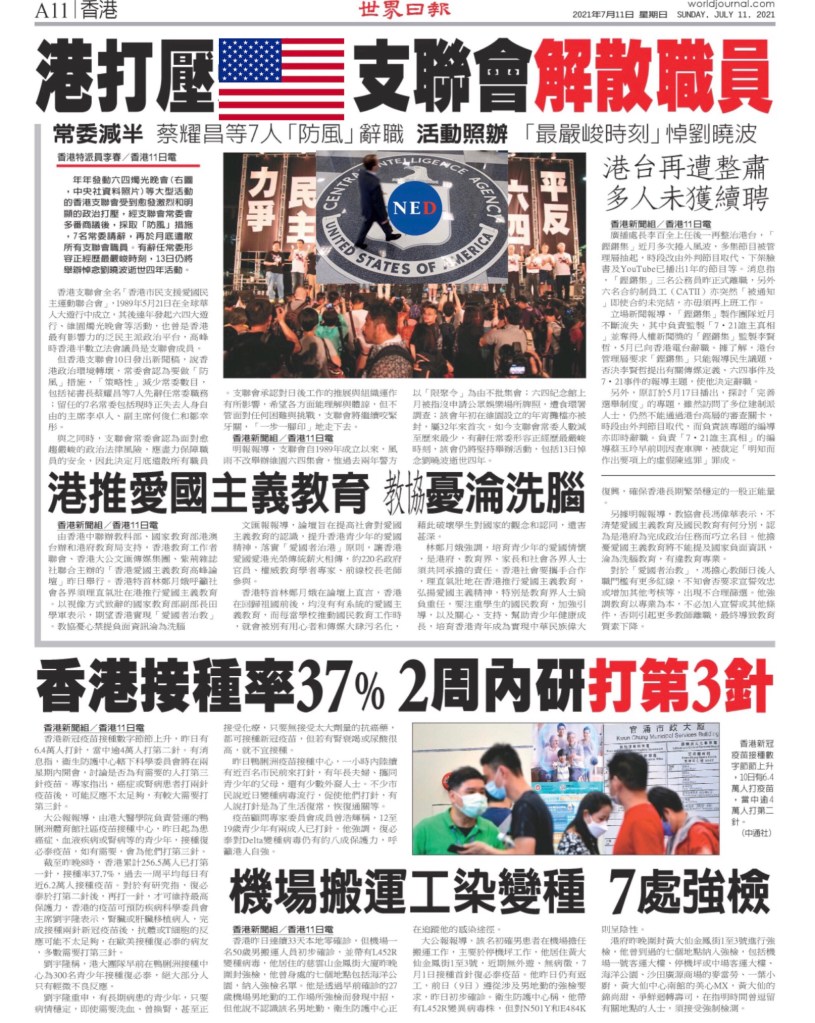 Another NED/CIA supported anti-China organization engaged in color revolution subversive activities disbanded after Hong Kong passing Homeland Security Law last year. 去年香港通過《國土安全法》後,另一個美國民主基金會/中情局支持從事顏色革命顛覆活動的反華組織被解散。World Journal Newspaper San Francisco, July 11 2021