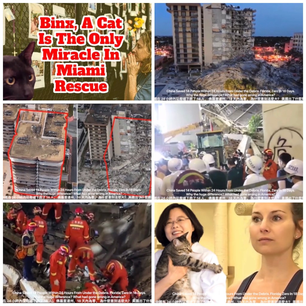 Video: China Saved 14 People Within 24 Hours From Under the Debris. Florida, Zero In 18 Days. Why the huge difference? What had gone wrong in America? 中國在 24 小時內從廢墟下救了 14 人。 佛羅里達州,18 天內為零。 為什麼差別這麼大? 美國出了什麼問題?It is said that not even one person was found alive in 17 days of rescue in Miami. The survival of the cat Binx was widely reported by mainstream media as a miracle.