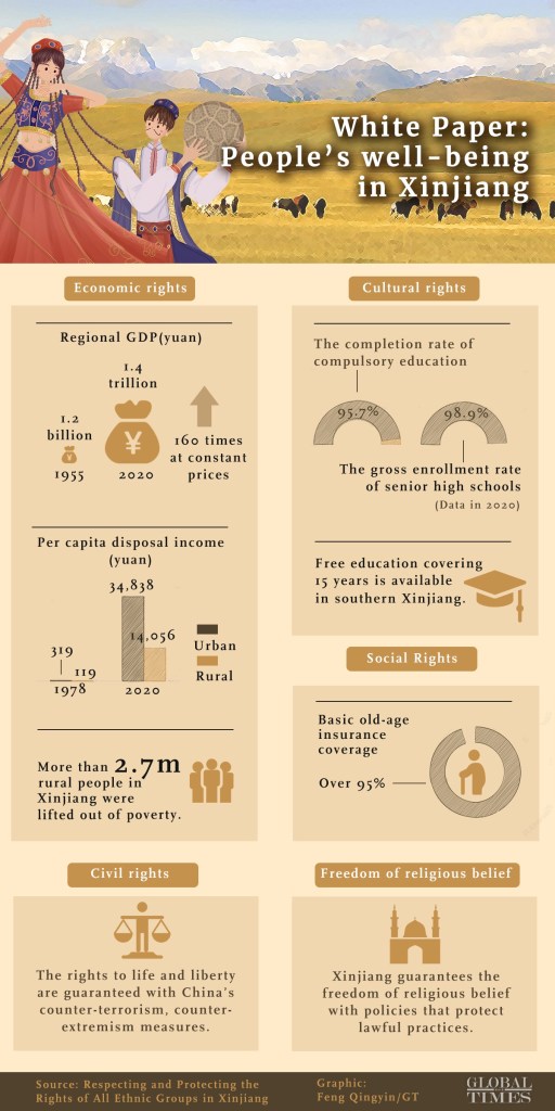 China released on Wednesday a white paper detailing the country’s progress in protecting the rights of all ethnic groups in Xinjiang Uygur Autonomous Region, the eighth white paper to introduce the progress on human rights in the region from all aspects since 2016. It also signals China’s increasing openness and transparency in displaying the achievements in the region, refuting rumors and lies made by the US-led campaign.