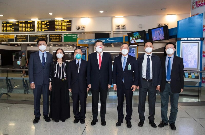 Ambassador Qin Gang, the new Ambassador Extraordinary and Plenipotentiary of the People’s Republic of China to the United States of America, arrived in the United States on July 28, 2021 to assume office. Upon arrival, Ambassador Qin was greeted by DCM of the Chinese Embassy Li Kexin, Consul General in New York Huang Ping and other Chinese diplomats in the U.S. Ambassador Qin is the eleventh Chinese Ambassador to the United States. Prior to his ambassadorship, he was Vice Foreign Minister of China. His predecessor, Ambassador Cui Tiankai, completed his tenure and returned to China on June 23.