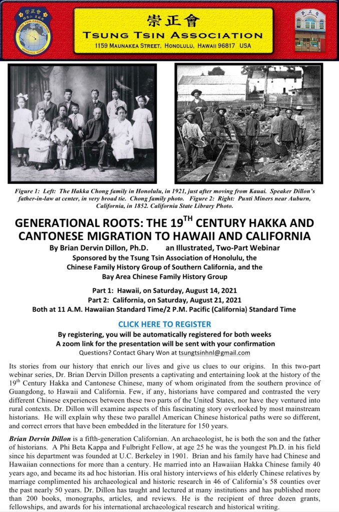 Please join us for a fascinating 2-part webinar series about the migration of the 19th Century Hakka and Cantonese people to America. Part I presented on Saturday, August 14, looks at the Chinese that emigrated to Hawaii and their early experiences there. Then in Part II on Saturday, August 21, we will examine those who settled in California. Dr. Brian Dervin Dillon will share some fascinating little known stories of how these two historical paths were so different, offering us further clues in our search for our origins.