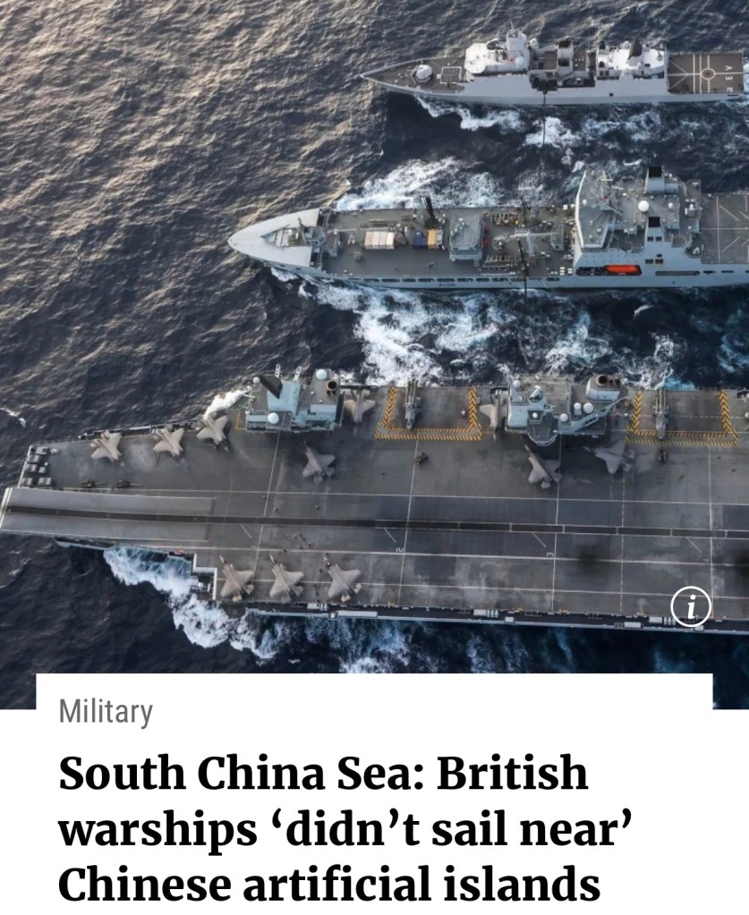 UK, a vassal state of US obligated to participate but afraid to offend Beijing, UK knew US will hang her out dry like Afghanistan when the time is right. The former once glorious British Empire knew not to cross China’s redlines. Britain’s HMS Queen Elizabeth aircraft carrier and its strike group did not sail near Beijing’s South China Seas islands when it was in there, according to the Chinese foreign ministry. 英國是美國的一個附庸國,有義務參與但又害怕得罪北京,英國知道美國會在適當的時候像阿富汗一樣把她吊死。 曾經輝煌的大英帝國知道不能越過中國的紅線。 據中國外交部稱,英國的伊麗莎白女王號航空母艦及其打擊群在北京的南海島嶼附近時並未接近中國南海島嶼.