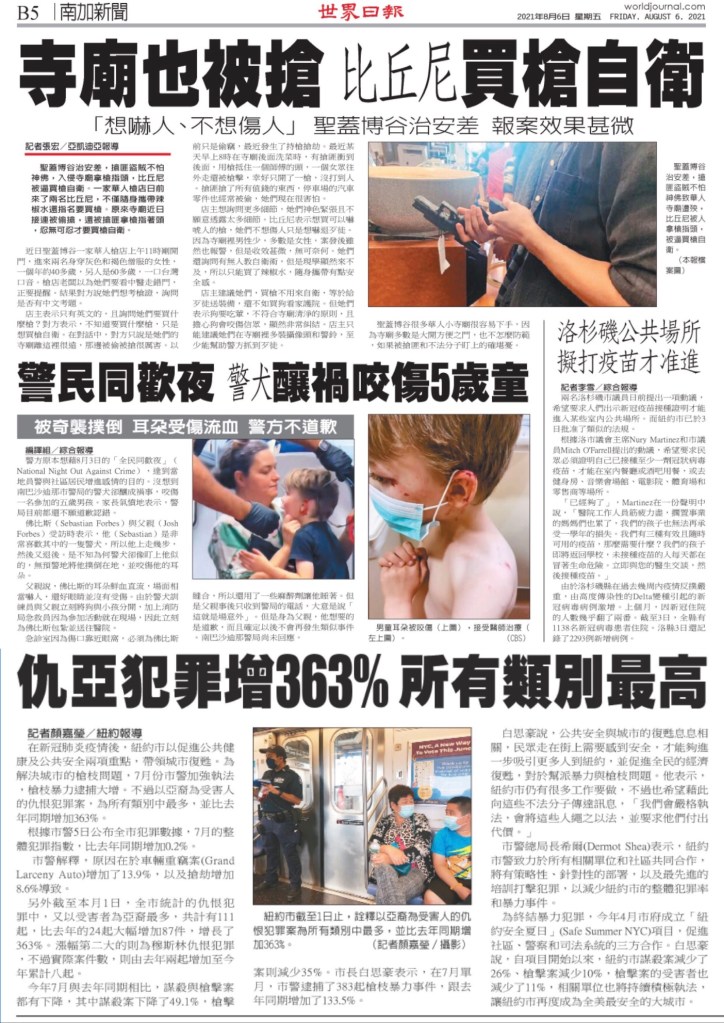 US Government selling hatred with fake news and propaganda against China, Chinese and Chinese Americans in US and around the world is paying off big time. Hate Crimes against Chinese and Asian Americans in the United States increase by 363%. 美國政府種族歧視用假新聞和針對中國和中國人在全球尤其是在美國宣傳宣揚仇恨得到非常理想的回報. 美國針對華裔和亞裔美國人的仇恨犯罪增加了 363%. World Journal Newspaper San Francisco 美國加州舊金山世界日報 August 6 2021
