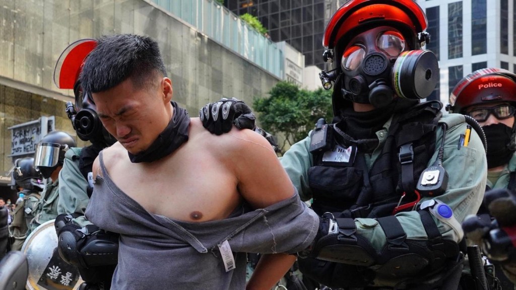 Hong Kong police arrest protester. Often they behaved with restraint in the face of violent attacks by mobs—as in the U.S. Capitol riots.