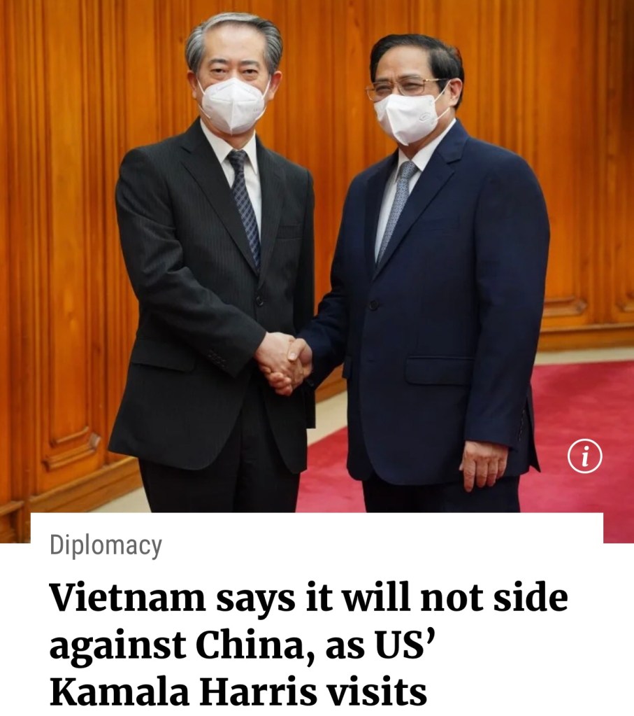 A slap at US face before it’s VP visit selling China containment – Vietnamese Prime Minister Pham Minh Chinh told China his country would not enter an alliance to confront Beijing, before he met US Vice-President Kamala Harris on Wednesday. 在副總統訪問中國之前,給美國一記耳光 – 越南總理在周三會見美國副總統卡馬拉哈里斯之前告訴中國,他的國家不會結盟對抗北京.