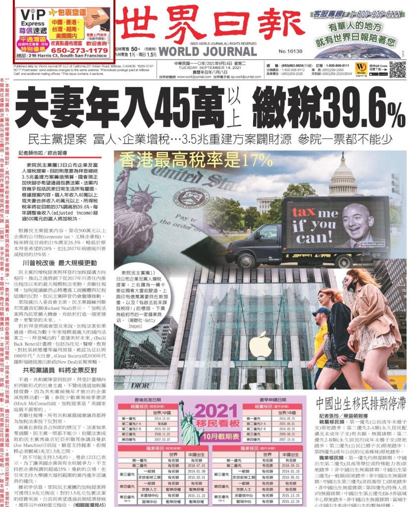 Highest Federal tax rates: US 39.6%, HK 17%, part of high tax is to support the private army provided to Fortune 500 companies using fake freedom democracy human rights and rules of laws to rob, steal and commit crimes against humanity around the world everyday. 香港最高稅率是17%, 美國最高聯邦稅是39.6% 美國高稅其中一個原因是用於支持向財富 500 強公司提供的免費軍隊, 使用虛假的自由民主人權和法律規則每天在世界各地搶劫、偷竊和犯下危害人類罪. World Journal Newspaper San Francisco 美國加州舊金山世界日報 September 14 2021