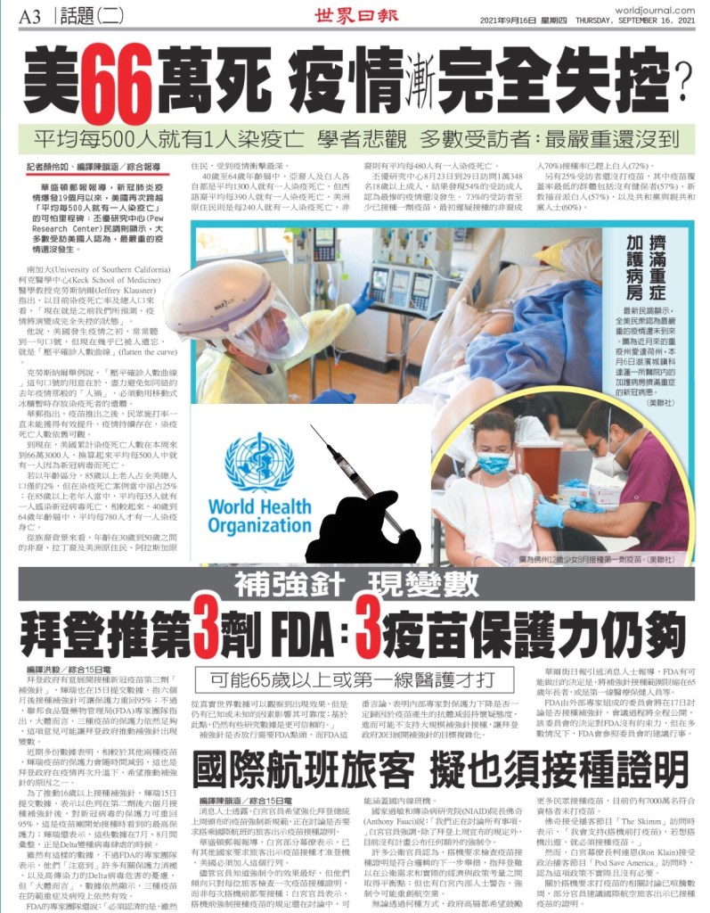 World Journal Newspaper San Francisco: US with 660,000 dead, COVID19 in US is getting out of control 美國加州舊金山世界日報 September 16 2021