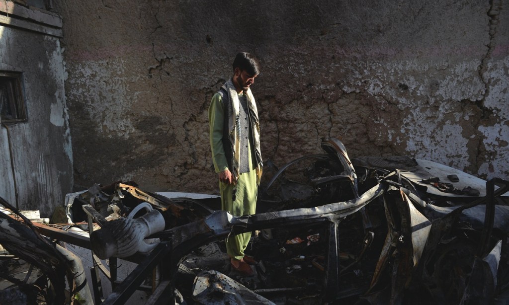 A resident stands amid the debris of a house damaged in a US drone strike in the Kwaja Burga neighborhood of Kabul on September 18, 2021.
