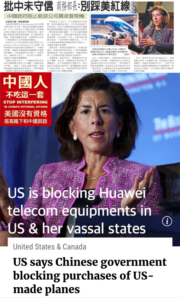US is blocking Huawei telecom equipments in US & her vassal states. US Commerce Secretary Gina Raimondo said on Tuesday the Chinese government is preventing its domestic airlines from buying “tens of billions of dollars” of US-manufactured planes.