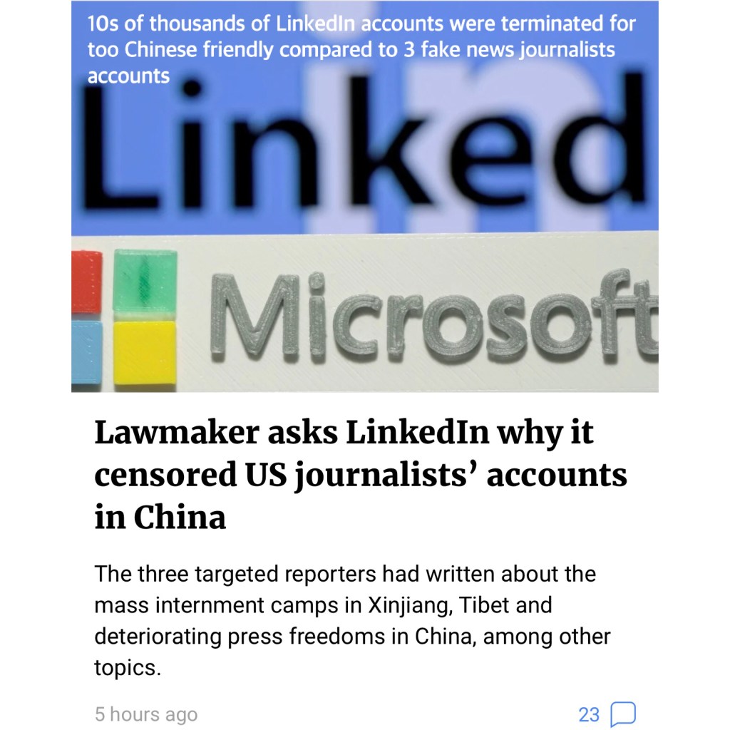 SCMP: 10s of thousands of LinkedIn accounts were terminated for too Chinese friendly compared to 3 fake news journalists accounts