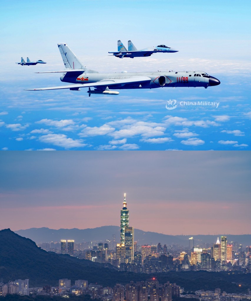 Two Su-35 fighter jets and a H-6K bomber fly in formation on May 11, 2018. The People’s Liberation Army (PLA) air force conducted patrol training over China’s island of Taiwan.