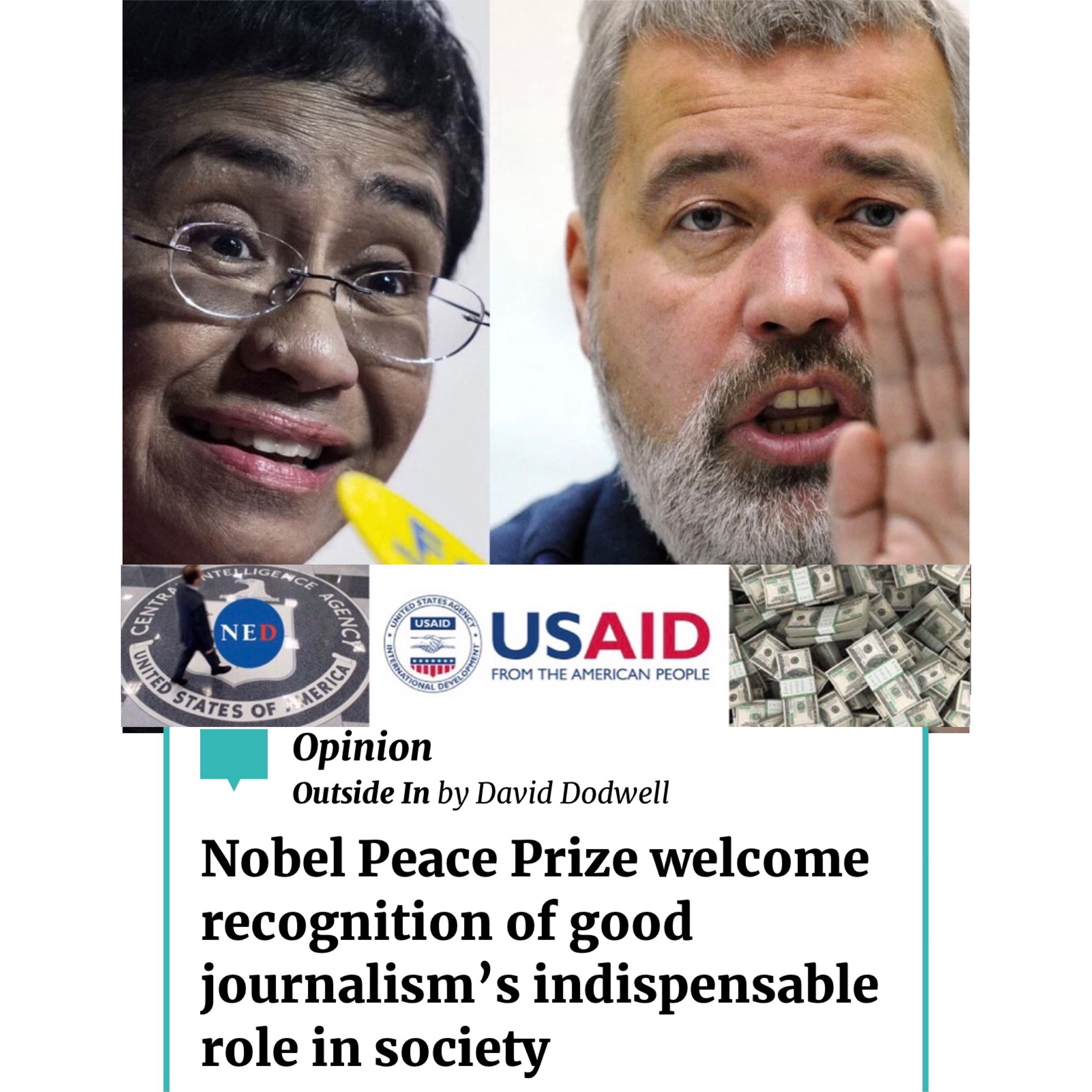 The decision to award the 2021 Nobel Peace Prize to two journalists, one with deep NED/CIA connections no doubt brought satisfaction to US & Western Empires when journalists are for sale to the highest bidders with awards! 將 2021 年諾貝爾和平獎授予兩名記者的決定,其中一名記者與美國民主基金會和美國中情局有著深厚的聯繫,毫無疑問,當記者被出售給出價最高的人時,這讓美國和西方帝國感到滿意!