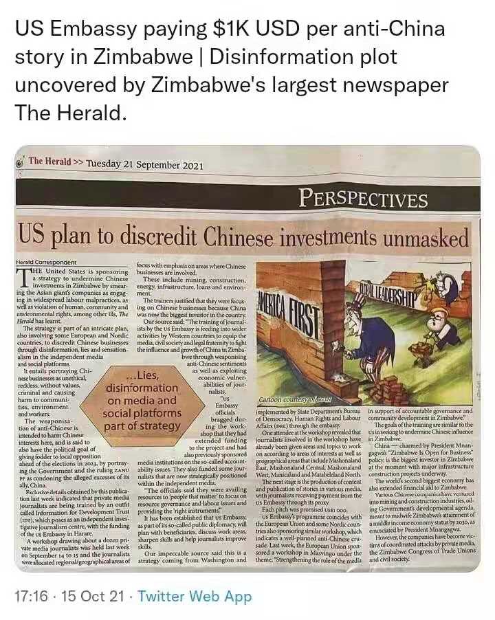 US Embassy pay US$1,000 per anti-China story in Zimbabwe uncovered by Zimbabwe largest newspaper, The Herald. 美國大使館被津巴布韋最大的報紙《先驅報》發現每一篇津巴布韋反華報導美國大使館支付 1,000 美元.