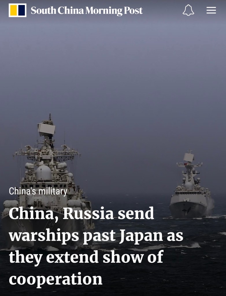 Freedom of Navigation: China and Russia have continued their military cooperation with an anti-submarine drill and a first joint passage through Tsugaru Strait in the Japanese archipelago to counter pressure from the US and her vassal states. 航行自由:中俄繼續通過反潛演習和首次聯合通過日本列島津輕海峽進行軍事合作,以應對來自美國及其附庸國的壓力.