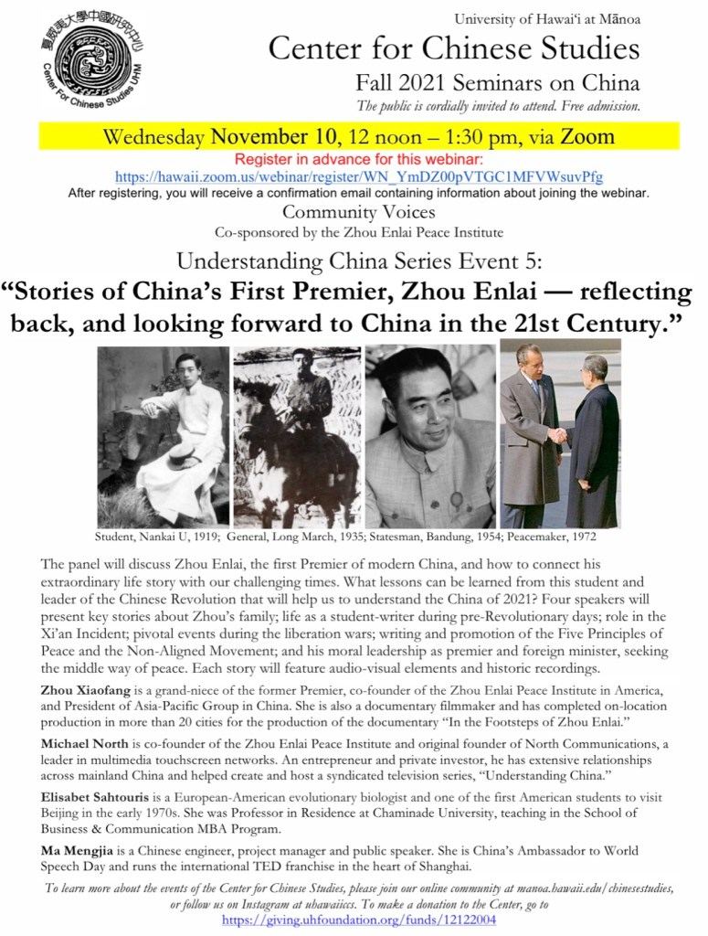 November 10, noon, webinar: ““Stories of China’s First Premier, Zhou Enlai — reflecting back, and looking forward to China in the 21st Century.” Register at