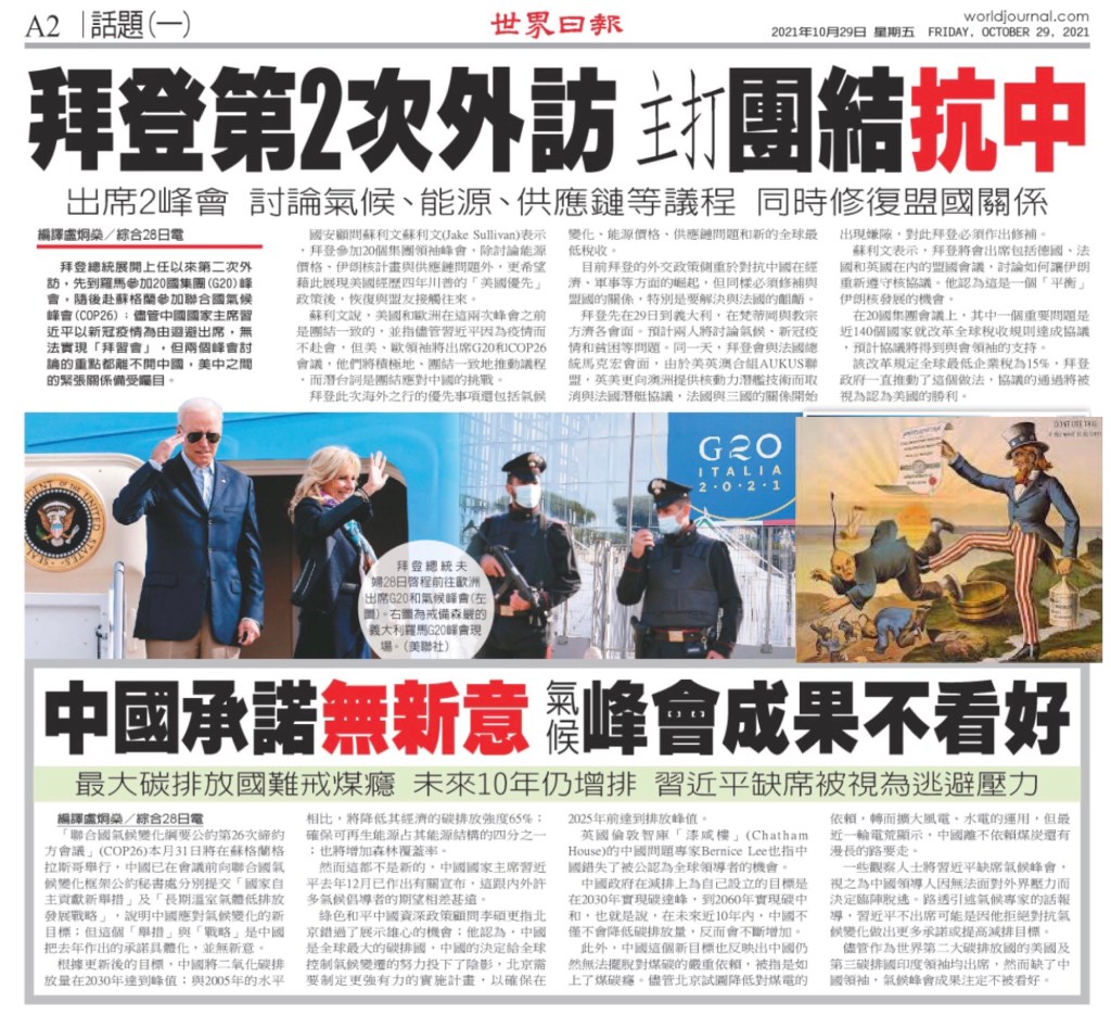 Biden 2nd out of country trip focus on uniting the AngloSaxon world forming anti-China Alliance stopping China rise at all cost by any means. 拜登第二次外訪的重點是團結盎格魯撒克遜(西人)世界,形成反華聯盟,不惜一切代價阻止中國崛起. World Journal Newspaper San Francisco 美國加州舊金山世界日報 10-29-2021