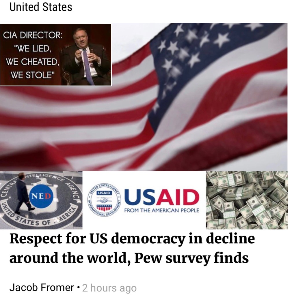 SCMP: World’s advanced economies still look with envy at US’s military strength, technological prowess, universities and its entertainment – but much less so at the most famous US export of all: democracy, fake democracy. 香港南華早報: 世界發達經濟體仍然羨慕美國的軍事實力、技術實力、大學及其娛樂活動 – 但更不用說美國最著名的出口產品:民主、虛假民主 並不感興趣.