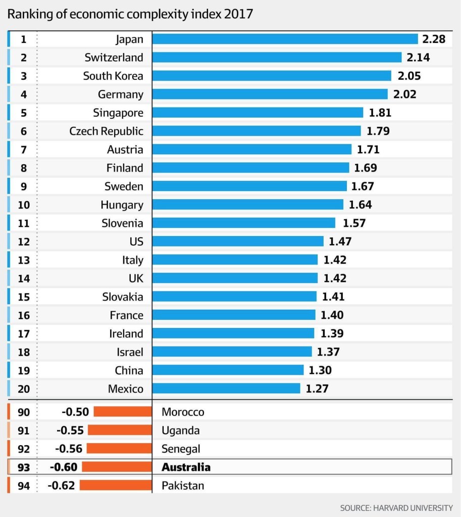 Put simply, Australia is rich and dumb, and getting dumber. Australia sells the world almost nothing, relative to total exports, that requires a degree to make. Australian economy: the 8th-richest nation in the study has the export profile of Angola. About 70% of products sold to foreign buyers, on a net basis, are minerals and energy. Add in food, alcohol, wool, tourism and metal products, and the figure rises to around 99%. https://www.afr.com/policy/economy/australia-is-rich-dumb-and-getting-dumber-20191007-p52y8i?fbclid=IwAR2AISUXQZK1sU68_ZlqW4Lqcb5gysGIVmnxxdxNNMAv7IIb73DsI5lxh-o Australia is #93 on export complexity