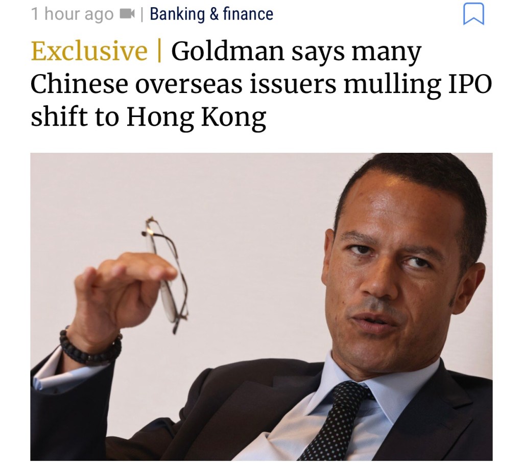 Another foolish move by US, huge windfall for Hong Kong. SCMP: Exclusive | Goldman’s top banker says many Chinese IPO clients considering shift to Hong Kong from US exchanges 美國的又一個愚蠢舉動,給香港帶來了巨大的意外收穫。 南華早報:獨家| 高盛首席銀行家表示,許多中國 IPO 客戶考慮從美國交易所轉移到香港.