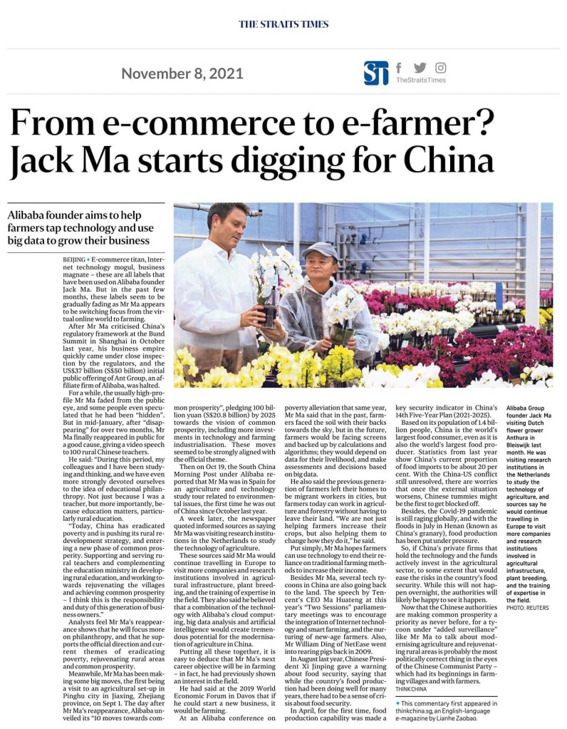 Straits Time Singapore: Chinese Jack MA sharing his Billions thru XJP call for common prosperity in Rural Farming Project. Posted byJohnsonwkchoiNovember 9, 2021Posted inUncategorized Straits Time Singapore: Chinese Jack MA sharing his Billions thru XJP call for common prosperity in Rural Farming Project. Share this: Share on X (Opens in new window) X Share on Facebook (Opens in new window) Facebook Like Loading...
