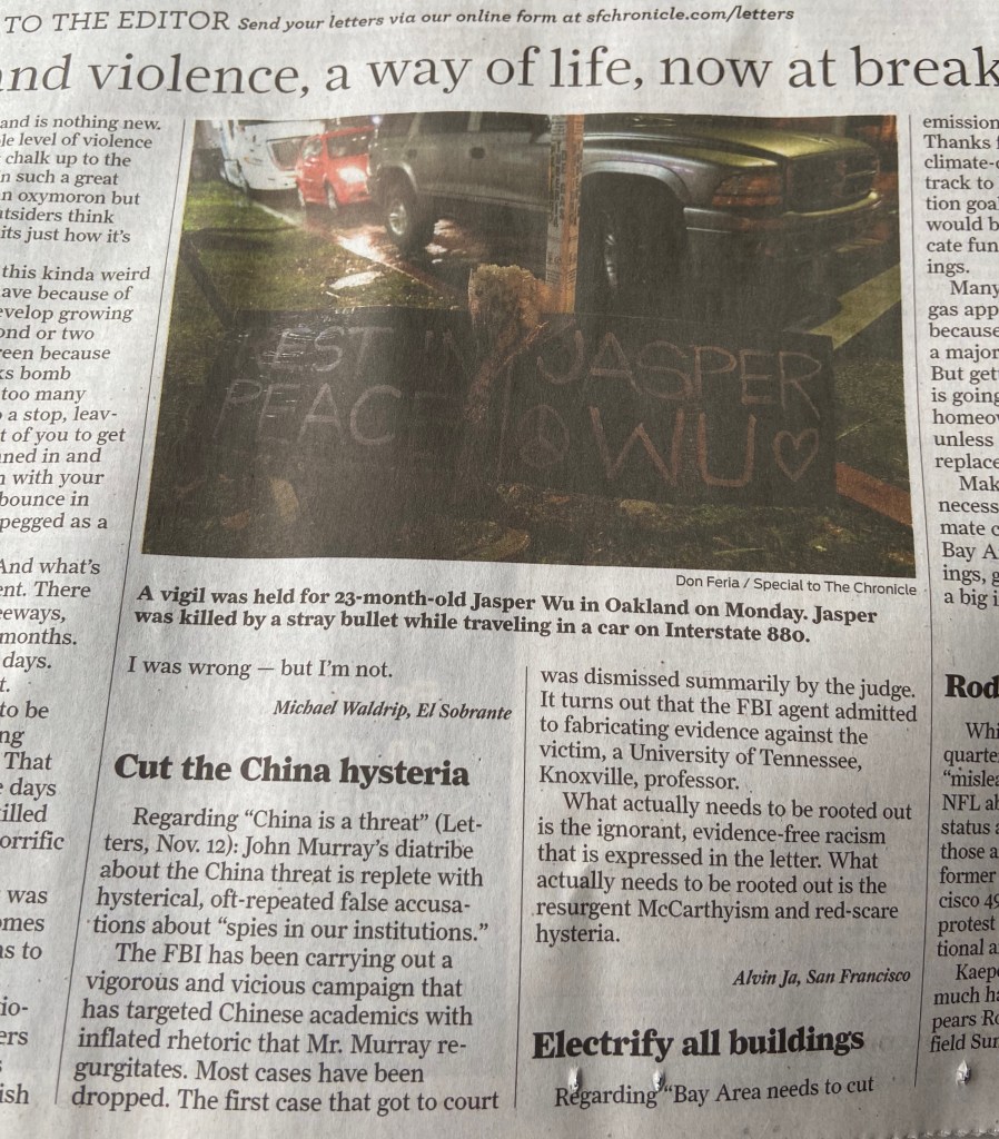 Of course there are none, because these racists claim “a thousand grains of sand” strategy–essentially tarring everyone. This is why Harry’s article was so lacking, and why Russell Jeung is out to lunch (because “selective targeting” is meaningless when you presume Asian students and researchers are guilty).