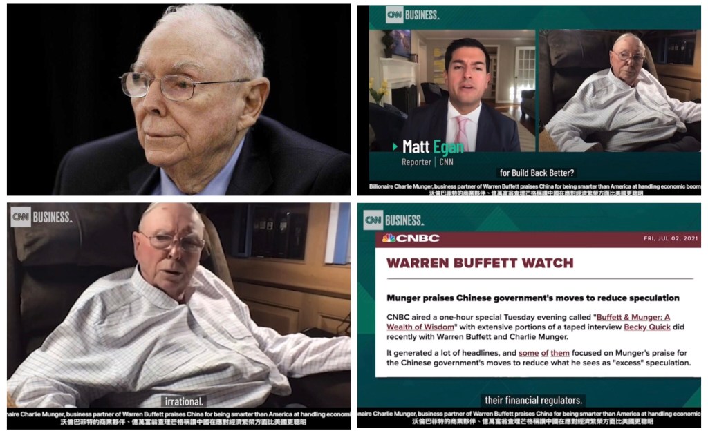 Video: Billionaire Charlie Munger, business partner of Warren Buffett praises China for being smarter than America at handling economic booms 沃倫巴菲特的商業夥伴、億萬富翁查理芒格稱讚中國在應對經濟繁榮方面比美國更聰明By Matt Egan, CNN Business November 3, 2021