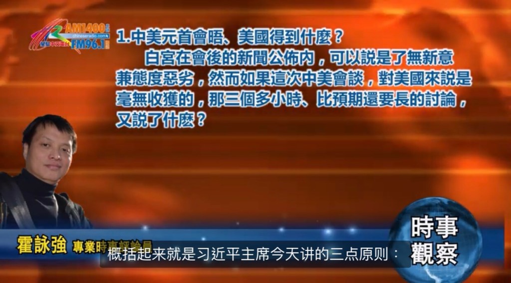 美國加州舊金山星島日報時事觀察 – 霍詠強 :中美元首會晤、美國得到什麼?