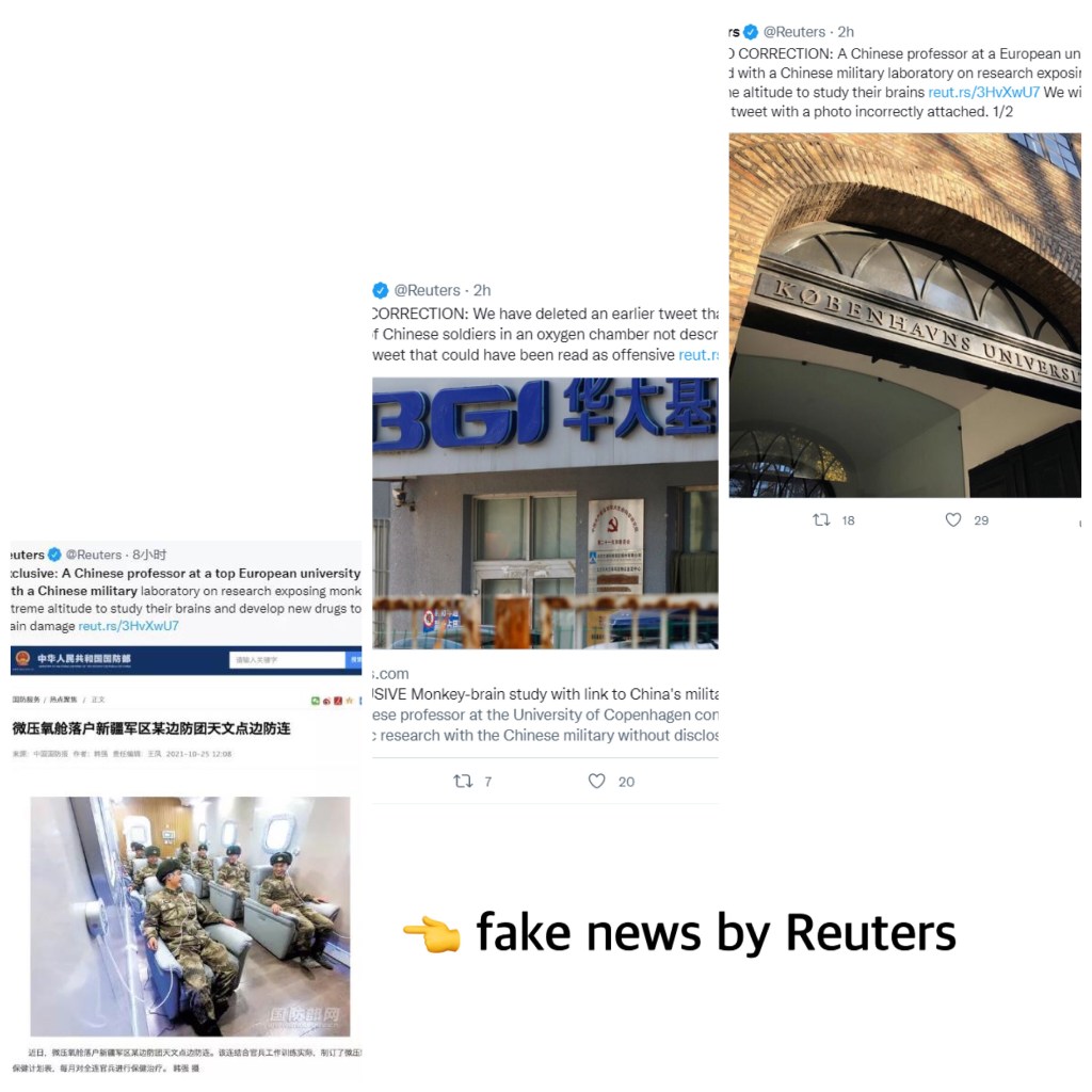 Chinese netizens became outraged after Reuters on Thursday published a tweet accompanying an exclusive report claiming that a Chinese professor at a top European university worked with a Chinese military laboratory on research exposing monkeys to extreme altitudes to study their brains and develop new drugs to prevent brain damage. The tweet was posted alongside a photo of Chinese soldiers in an oxygen chamber which had nothing to do with the content of the tweet.