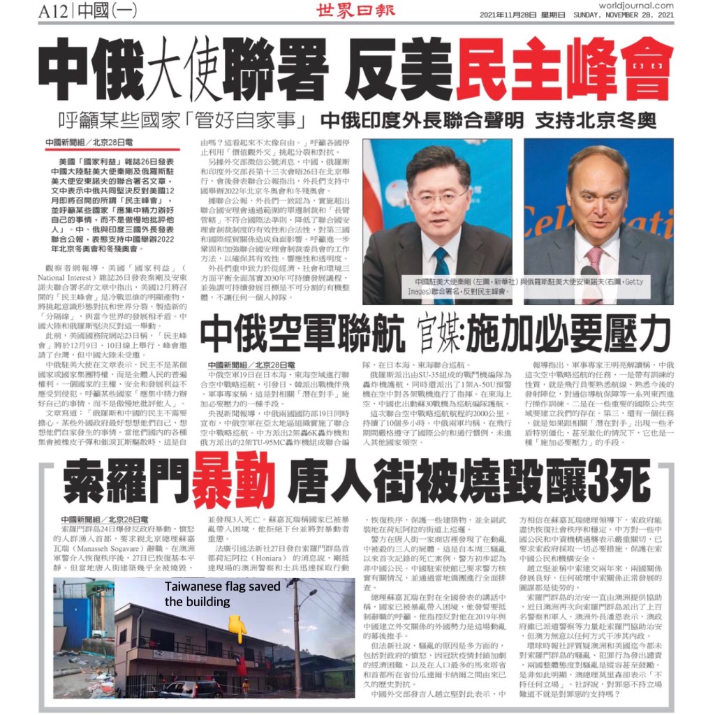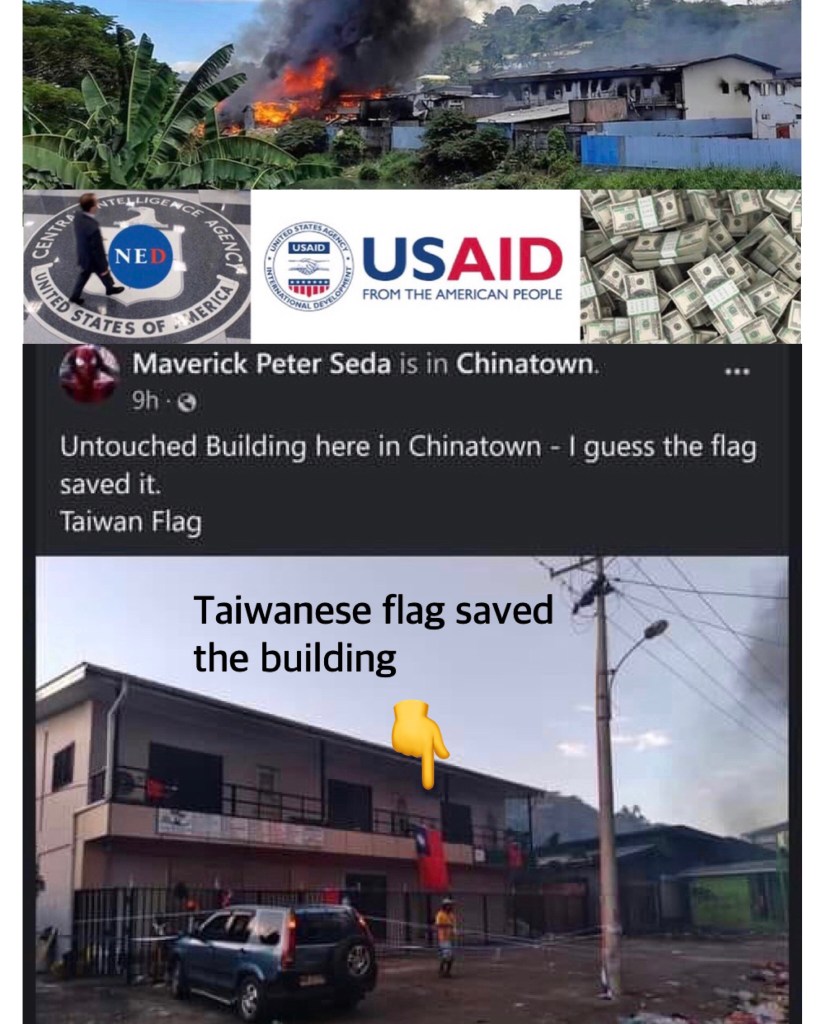 NED & Taiwan Gov’t backing regime change at the Solomon Islands set Chinatown on fire except the one with Taiwanese flag 美國民主基金會和台灣政府支持所羅門群島的政權更迭, 火燒唐人街, 有台灣省旗幸免
