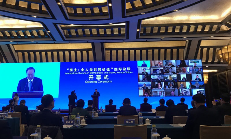 With the US is about to convene a so-called summit for democracy with the aim of maintaining hegemony and containing China, a two-day international forum on the shared human values of democracy kicked off on Saturday in Beijing, where guests from more than 120 countries and regions will engage in extensive discussions to break the monism and narrative hegemony in democracy.