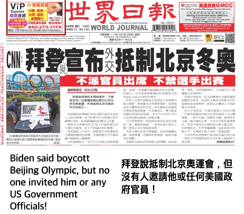 Biden said boycott Beijing Olympic, but no one invited him or any US Government Officials! Posted byJohnsonwkchoiDecember 6, 2021Posted inUncategorized Biden said boycott Beijing Olympic, but no one invited him or any US Government Officials! 拜登說抵制北京奧運會,但沒有人邀請他或任何美國政府官員! Share this: Share on X (Opens in new window) X Share on Facebook (Opens in new window) Facebook Like Loading...