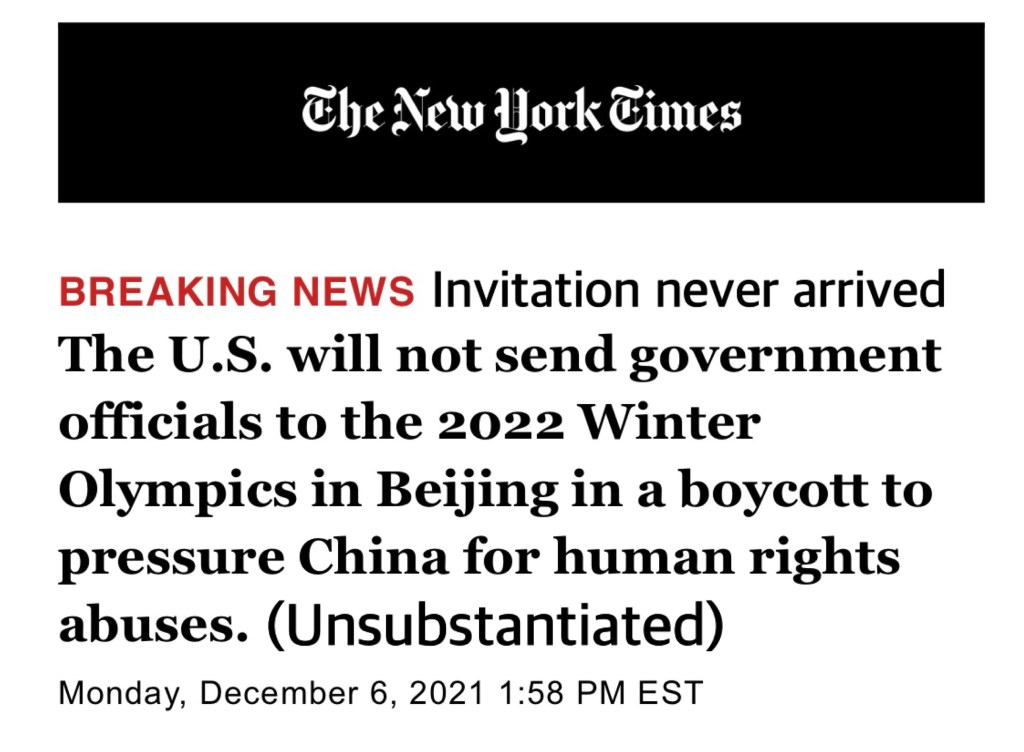 NYT: Breaking News – Invitation never arrived – The U.S. will not send government officials to the 2022 Winter Olympics in Beijing in a boycott to pressure China for unsubstantiated human rights abuses. 紐約時報:突發新聞 – 中國邀請從未到達 – 美國不會派政府官員參加 2022 年北京冬奧會,對毫無根據的侵犯人權行為(又吹水) 抵制向中國施壓 (跌落地拿沙).